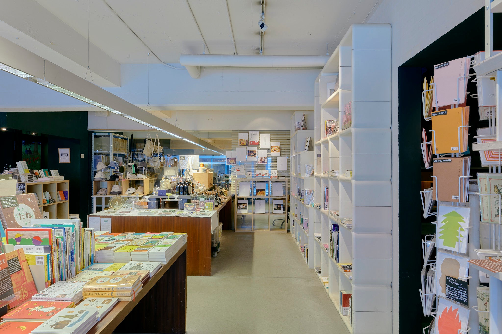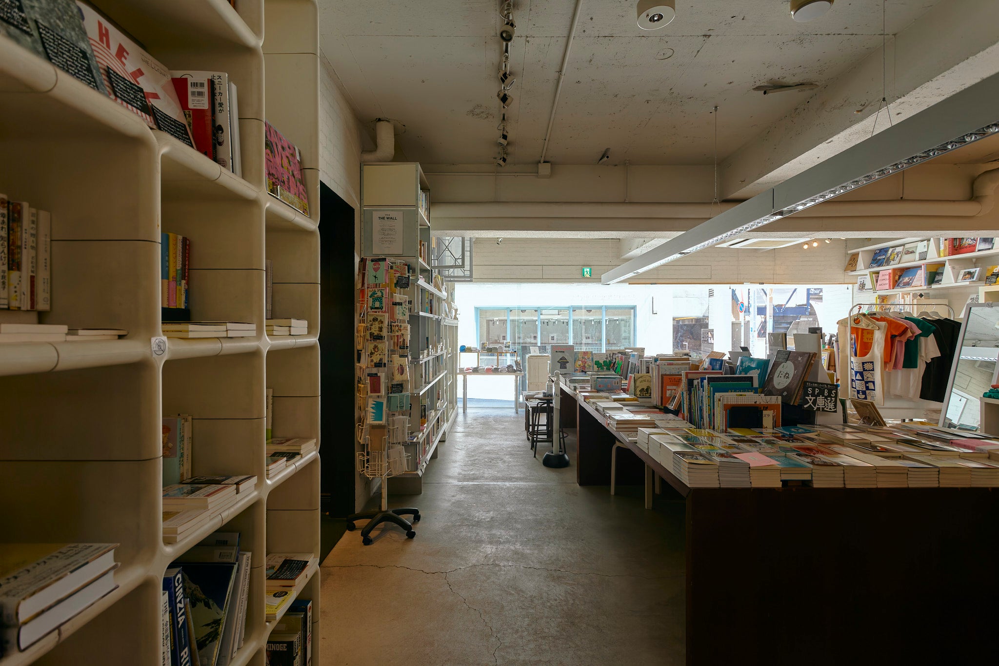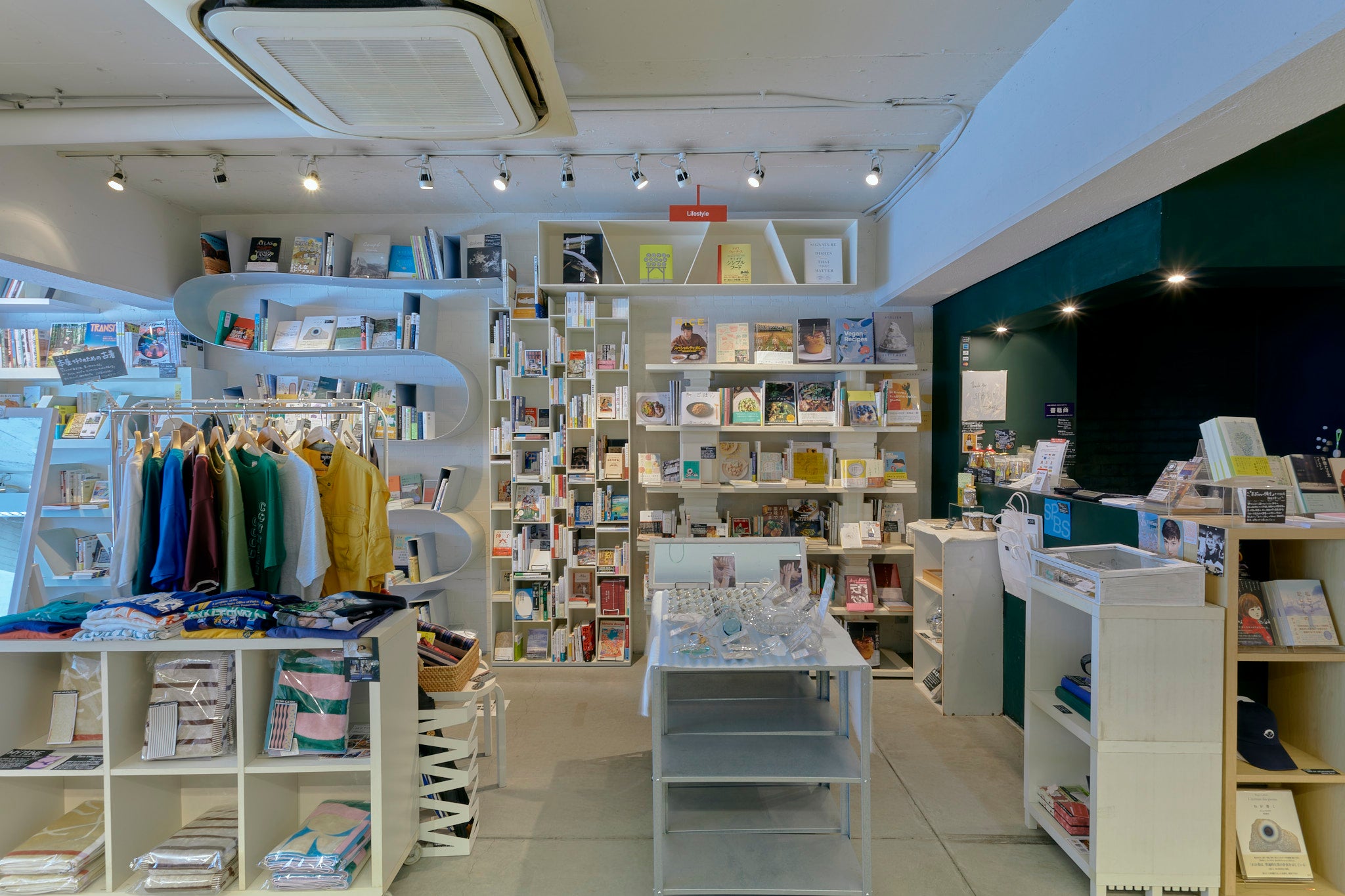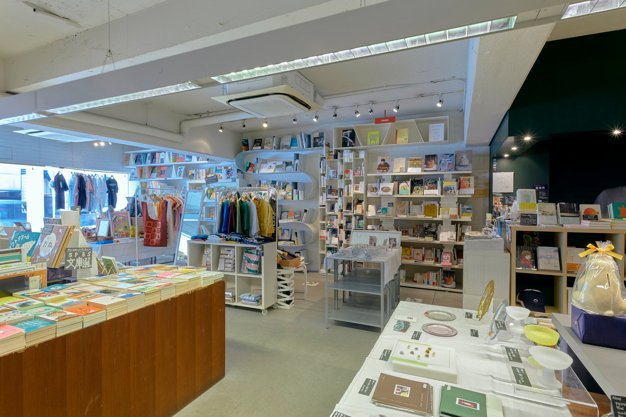 SPBS本店は白い壁と珍しい形の本棚が並ぶお店です。日中は自然光が差し込みます。本や雑貨のある空間でのファッション誌の撮影や、テレビドラマ・PVの収録など、さまざまな用途にご利用いただけます。