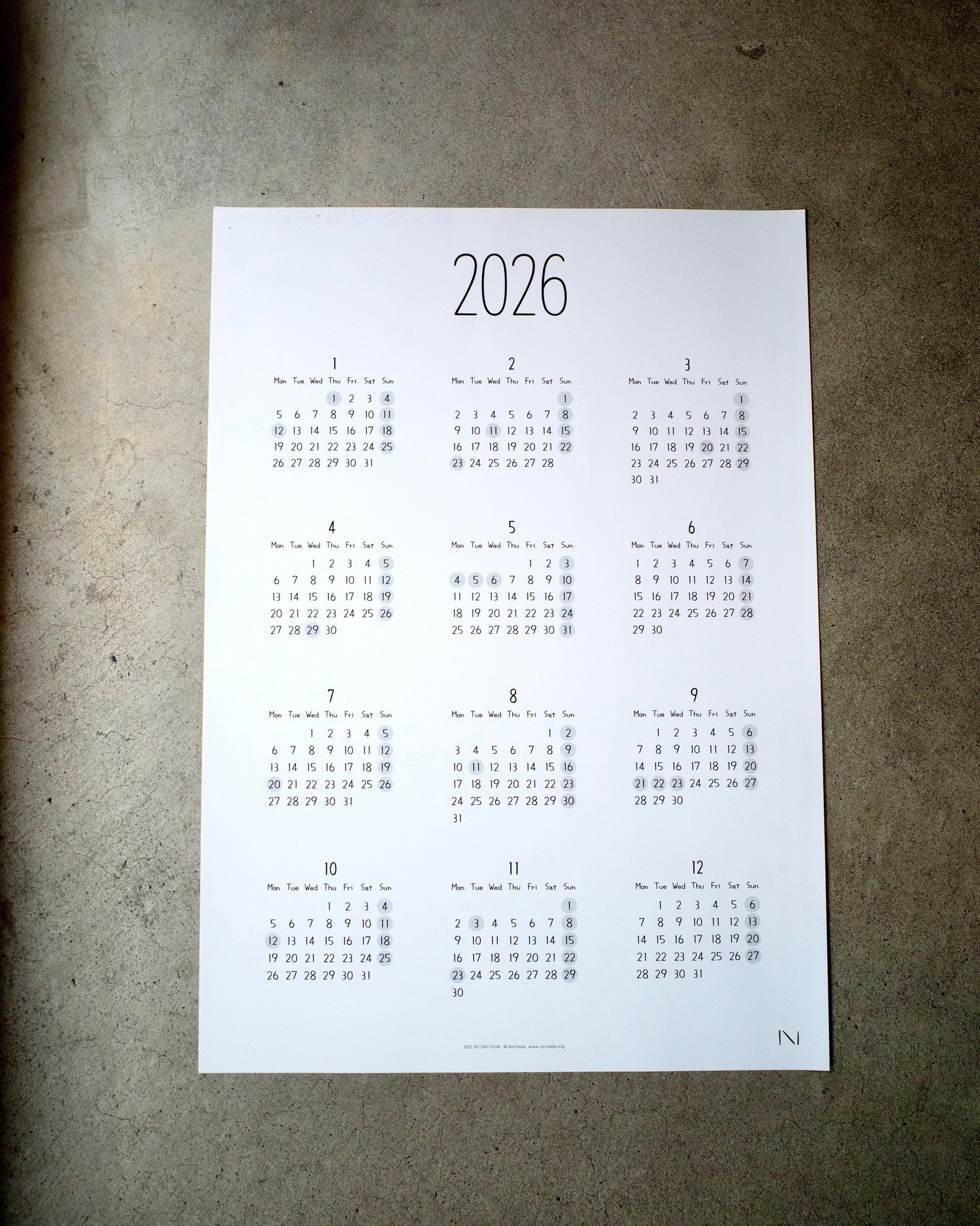 B3サイズの2026年カレンダー「SEE BY DAY 2026」(poster)。曜日と数字は描き文字でデザインされています。壁貼りカレンダーとして使用頂けます。